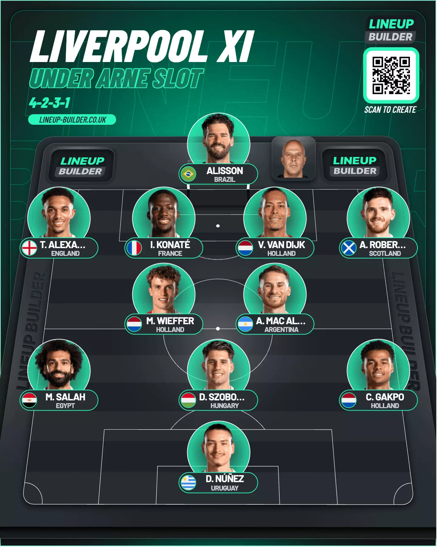 Από εκεί και πέρα, δεξιά θα είναι ο Μοχάμεντ Σαλάχ, «δεκάρι» ο Σόμποσλαϊ και αριστερά ο Κόντι Χάκπο. Ναι, ο Ολλανδός και όχι ο Λουίς Ντίας, με τον Κολομβιανό να χάνει την θέση του, καθώς ο Σλοτ γνωρίζει την πρώτο από τη συνύπαρξή τους στην Ολλανδία.