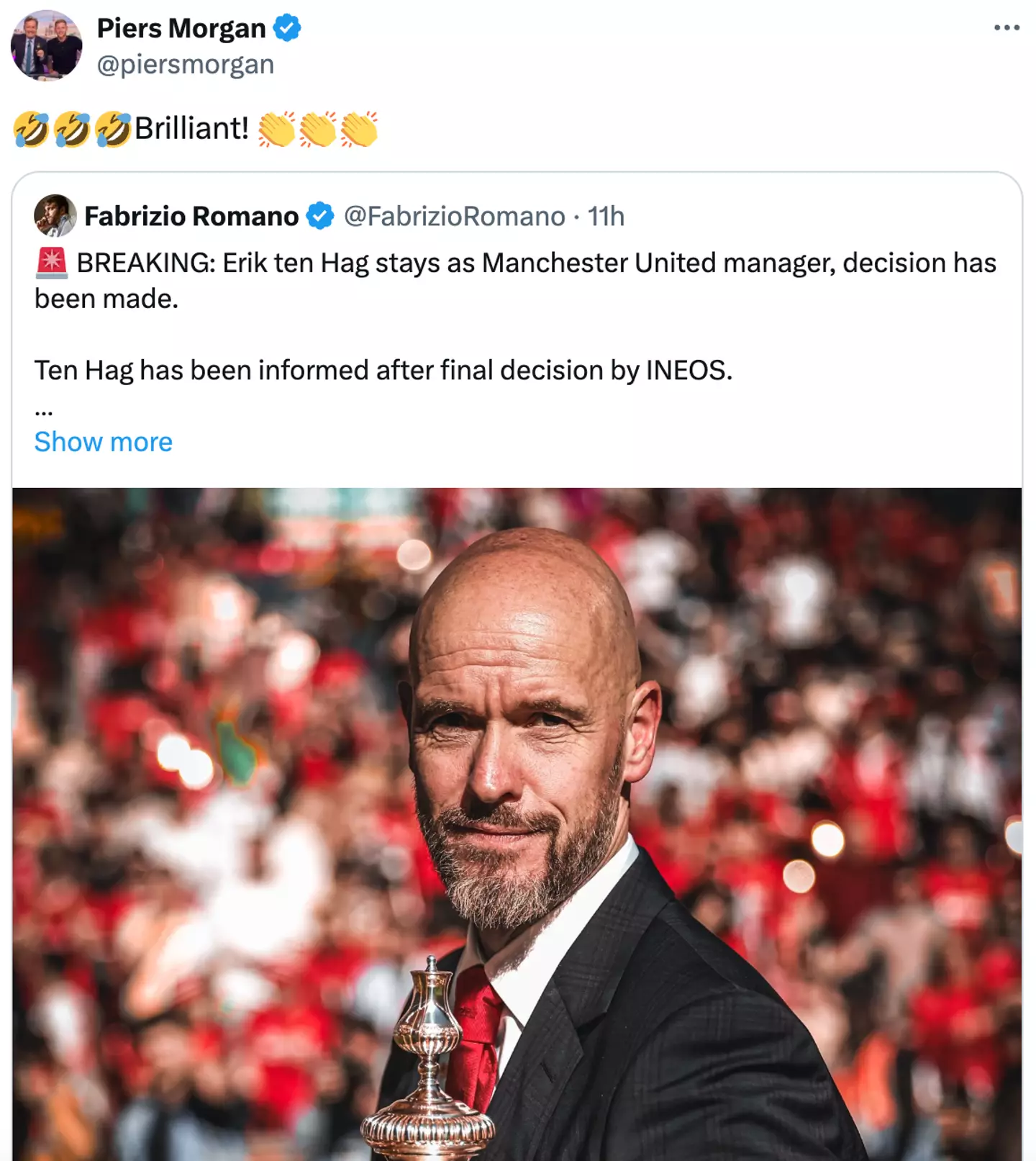 Οι αντιδράσεις, μετά από την εν λόγω απόφαση, είναι αρκετές, αλλά ένας γνωστός και… μη εξαιρετέος δημοσιογράφος, θέλησε και πάλι να «ειρωνευτεί» τη Μάντσεστερ Γιουνάιτεντ. Ο λόγος για τον Πιρς Μόργκαν, τον οποίο άπαντες θα θυμάστε, λόγω της συνέντευξης που πήρε στον Κριστιάνο Ρονάλντο, με τον οποίο διατηρεί φιλικές σχέσεις.