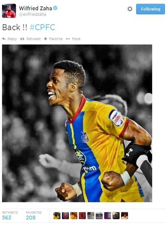 Την επιστροφή του στην Κρίσταλ Πάλας επισημοποίησε ο Γουίλφριντ Ζαχά μέσω των Μέσων Κοινωνικής Δικτύωσης, αν και στην συνέχεια κατέβασε το ποστάρισμά του.