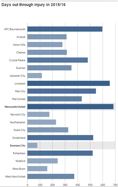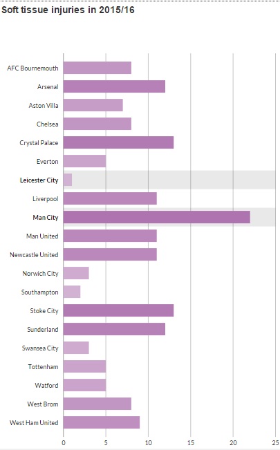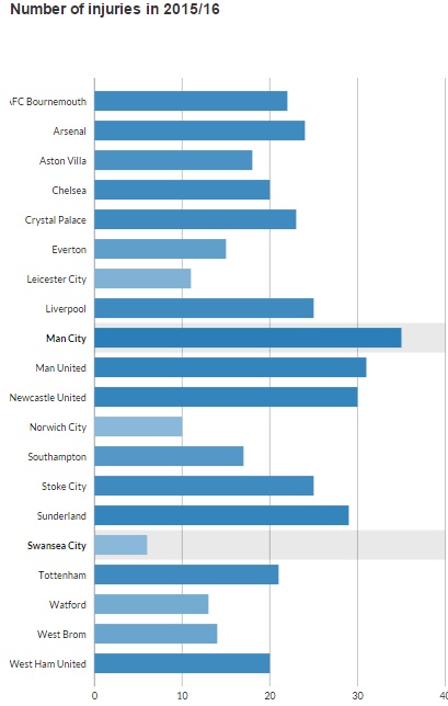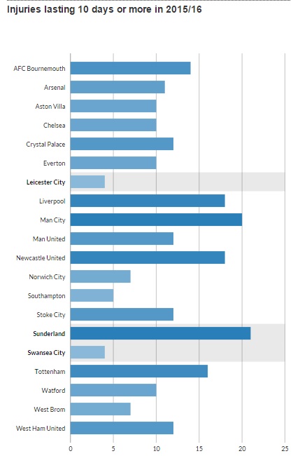 Η Λέστερ του Κλαούντιο Ρανιέρι είναι η πιο τυχερή απ' όλες, αφού έχει τους λιγότερους τραυματισμούς φέτος και ίσως αυτό τη βοηθάει να παραμένει στην κορυφή, ισοβαθμώντας με τη Μάντσεστερ Σίτι. Ακόμα μια ομάδα με ελάχιστους τραυματισμούς είναι η Σουόνσι...